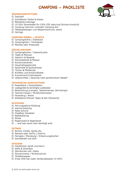 Ich hoffe die Informationen haben Euch geholfen und Ihr vergesst beim nächsten Camping nichts wichtiges. Als Ergänzung habe ich mal eine Allgemeine Packliste als PDF für Euch erstellt, klickt auf das kleine Bild um die Packliste herunterzuladen.
