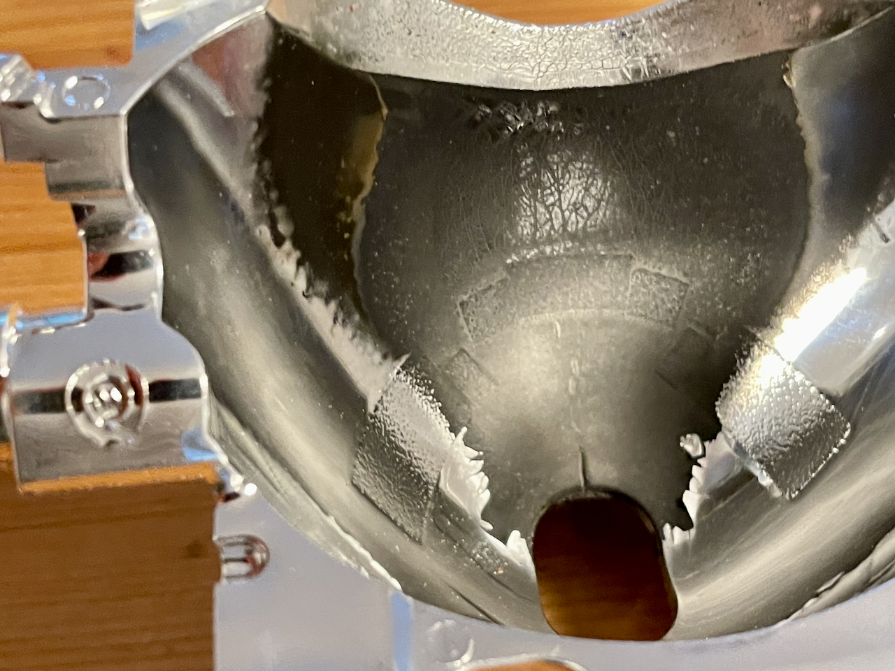 Das Reflektormaterial ist ja auf hitzestabilem Kunststoff und ist bedampft um die Chrom-Reflektorschicht zu bekommen. Diese Schicht ist auch aus einem Kunststoff und durch die Hitze der Xenon-Birnen verbrennt der nach und nach zu grauer „Asche“, welche aber am Ort kleben bleibt.